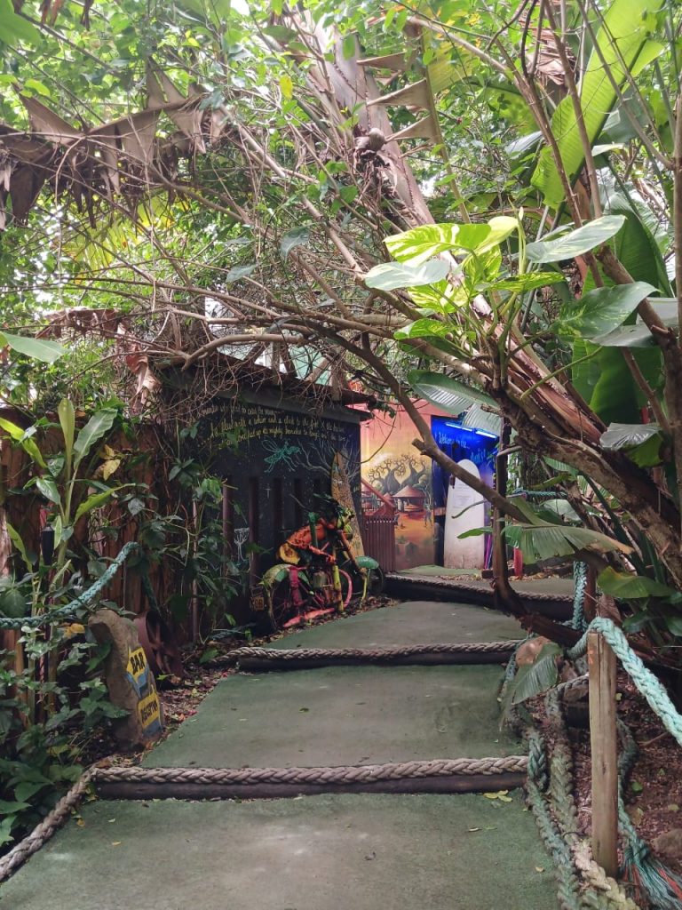 Our home for the night? The Angel Hut — a cosy wooden en-suite cabin nestled among the trees. It had a rustic charm that felt both wild and romantic. We dropped off our bags and set off to explore the jungle-like grounds.